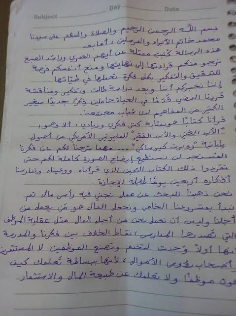وكشف والد الصبي أن الرسالة تكونت من أربع صفحات ، وجاء في مضمون الرسالة أن كلا الطالبين على قدر كافي من الوعي والمسؤولية، والسبب وراء هذا الاختفاء تأثرهما بفكر كتاب” الأب الغني والأب الفقير” للمليونير الأمريكي ” روبرت كيوساكي”، وحسب قولهم أن هذا الكتاب قد ساعد على تكوين فكر مستجد لديهم ، وكان الهدف وراء هذا الاختفاء بحثهما عن العمل ليجمعا المال، وعمل مشروعا خاصا بهما.