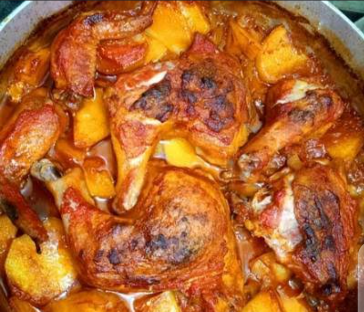 1- نقوم بتتبيل الدجاج فى البهارات و الصلصة مع عمل ثقوب في الدجاج بالسكينة ونتركها لمدة ساعة على الأقل ؛ ثم نضع الطماطم و الثوم و نصف كوب ماء في الخلاط الكهربائي ، و نقوم بخلط قطع البصل مع الفلفل الاسود في صينية الفرن و رشة بهارات ثم تضاف شرائح البطاطس و الفلفل الاخضر و تقلب مع البصل.