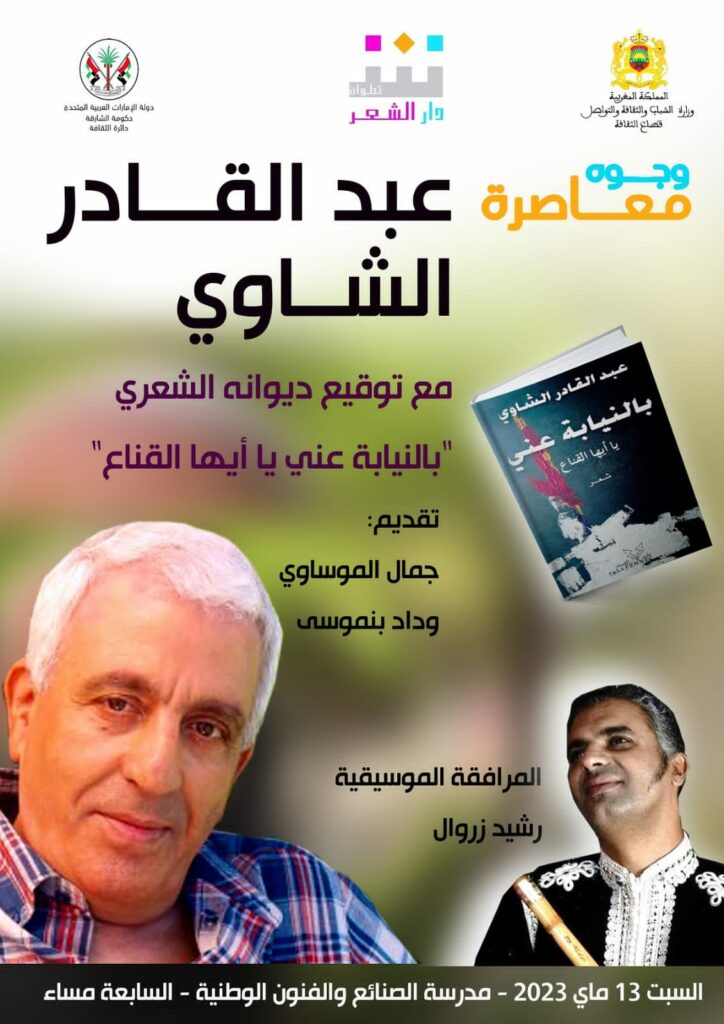 وأشارت المصادر إلى أن الشاوي ضيفا على مظاهرة “وجوه معاصرة” ، في دورتها الثانية ، والتي تشهد عرض وتوقيع مجموعته الشعرية “نيابة عني يا قناع” ، بمشاركة الشاعر جمال الموساوي والشاعرة وداد بن موسى بمرافقة عازف الفلوت رشيد زروال.