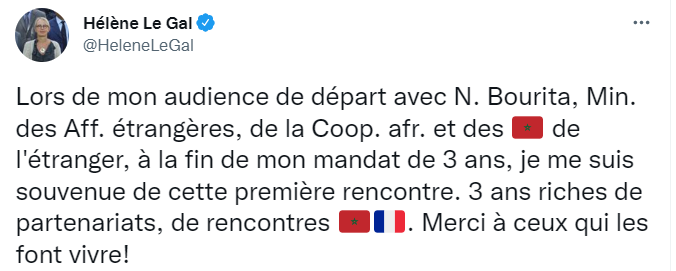 أعلنت سفيرة فرنسا في الرباط، هيلين لوغال، بأن مهمتها انتهت بشكل رسمي في المملكة المغربية.