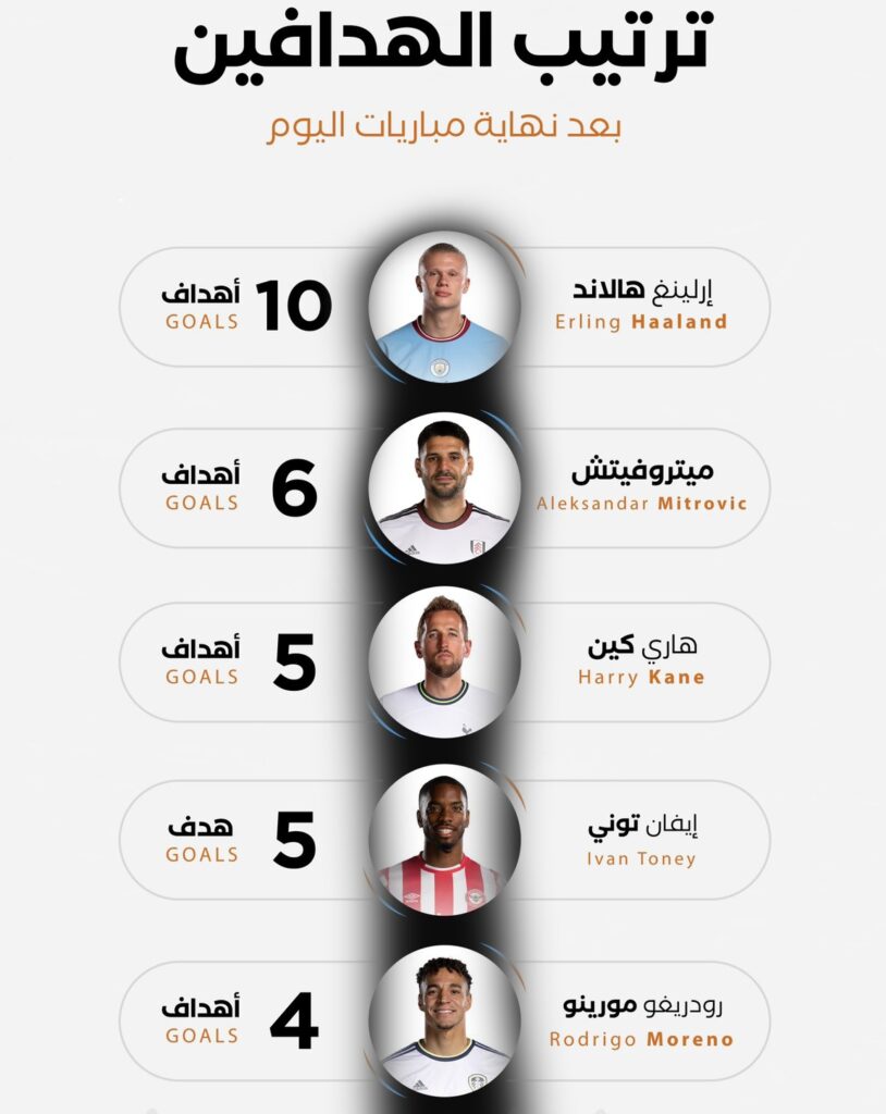 -يقدم موقع “قوس Kaws” ترتيب هدافي الدوري الإنجليزي بعد نتائج مباريات اليوم السبت الموافق يوم 4 من شهر سبتمبر لعام 2022، في الجولة السادسة، للموسم الحالي 2022\2023.