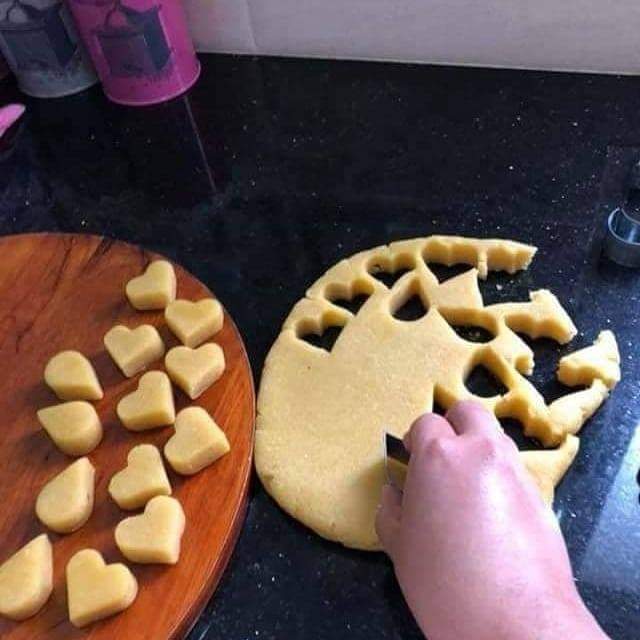 نتركها لترتاح اقل شي نص ساعة و من ثم نفردها و نطبعها فاستخدام طوابع صغيرة على شكل هلال و نجمة او قلب (الشكل إختياري).