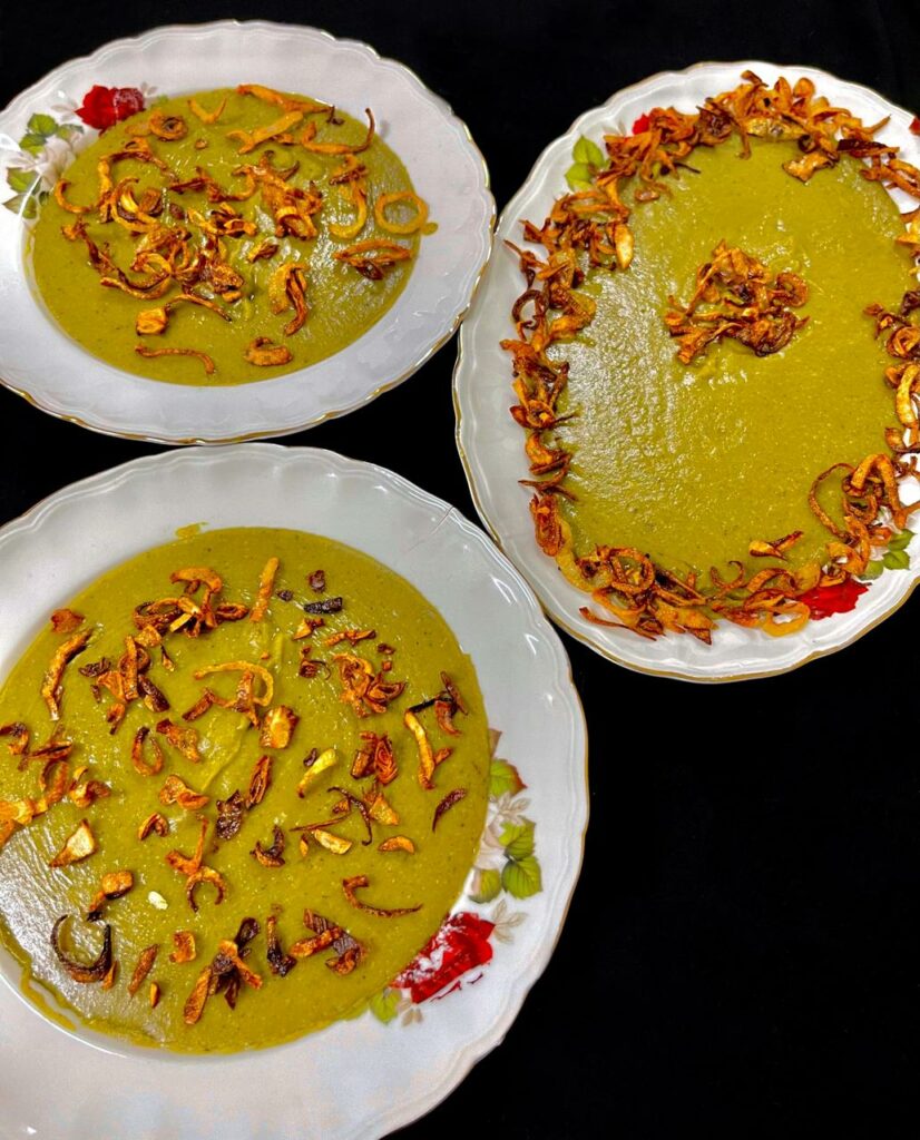 -يتم تقديم البصارة في أطباق ونضع البصل المقلي على الوجه للتزيين.
