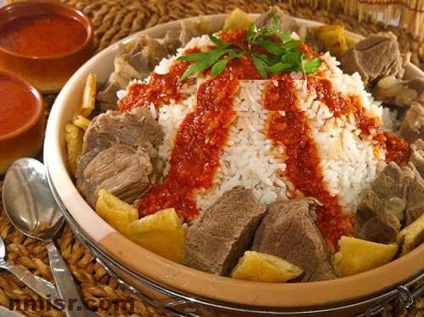 7- يُضاف باقي خليط الثوم والخل على الوجه، ثم تُوضع اللحمة على الوجه، ويُقدّم الطبق ساخناً مع طبق الصلصة الجانبي