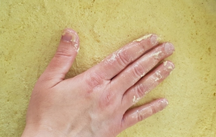 - ضعي السميد والطحين والسكر والخميرة والبيكنج باودر والكركم في وعاء كبير، وقلبي جيدًا حتى تمتزج المكونات، ثم أضيفي السمن واعجني بيديكِ، حتى يتشرب السميد السمن، ثم أضيفي ماء الورد والحليب تدريجيًّا، واعجني جيدًا لمدة خمس دقائق، ثم غطي الوعاء بورق نايلون، واتركيه في مكان دافئ لمدة 30 دقيقة.