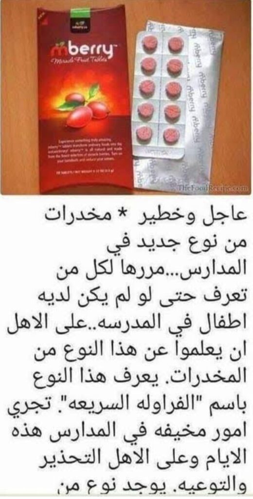 إنتشر في الفترة الأخيرة على مواقع التواصل الإجتماعي صور لحلوى بطعم الفراولة ، وتسمى حلوى الفراولة السريعة ولكنها في الحقيقة أقراص مخدرة تسبب للأطفال حالة من الهيسترية وهي متداولة في المدارس الأردنية و إنتشرت المنشورات لتحذر الطلبة وأولياء الأمور من شراء هذه الحلوى .