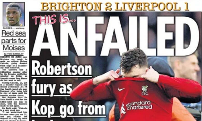 وتحت عنوان “هذا فشل” تحدثت صحيفة “ذا صن” البريطانية عن خسارة الريدز أمام برايتون والخروج من كأس الاتحاد، كما كتبت “أندى روبرتسون يعتذر لجماهير ليفربول”.
