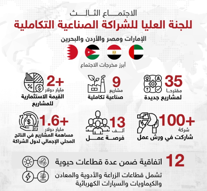 وقد عقد من قبل الاجتماع الأول للجنة العليا للشراكة الصناعية التكاملية لتنمية اقتصادية مستدامة، بالعاصمة الإماراتية أبوظبي، الذي كان يهدف لتسريع وتيرة الفرص التكاملية الصناعية لزيادة الفائدة الاقتصادية، وتعزيز التعاون والتكامل بمشاركة المزيد من القطاعات، والتركيز على خمس قطاعات شملت الزراعة والأغذية والأسمدة والأدوية والمنتجات والمعادن والبتروكيماويات.