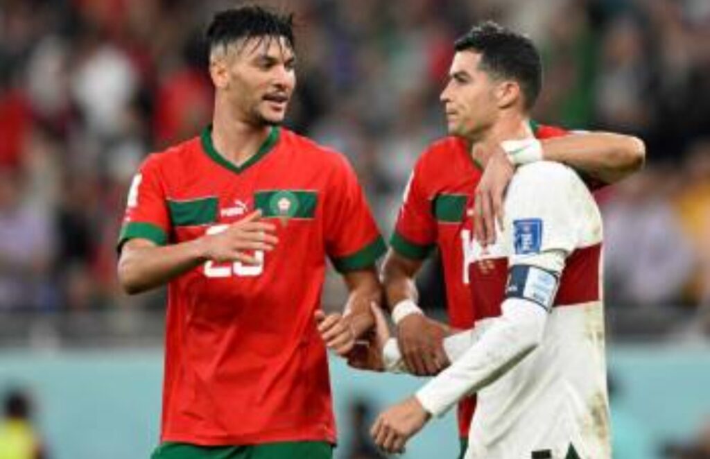 يواسي جواد الياميق وأشرف داري كريستيانو رونالدو عند بكائه نتيجة هزيمة البرتغال أمام أسود الأطلس وخروجها من الدور الربع النهائي من مونديال قطر .