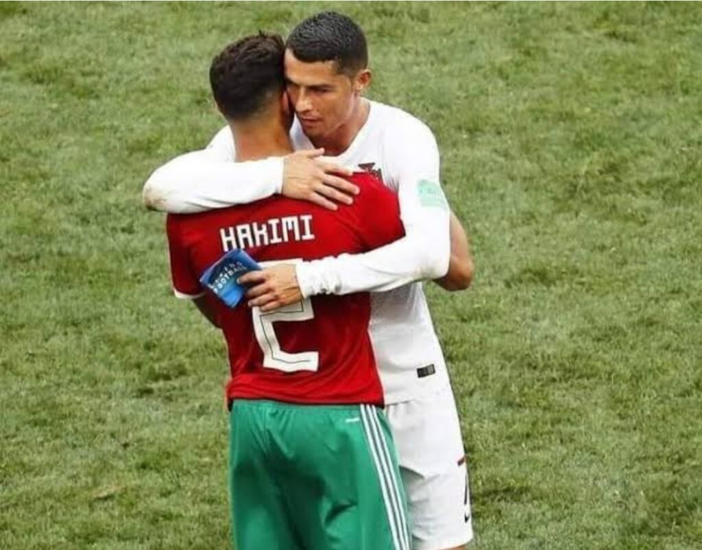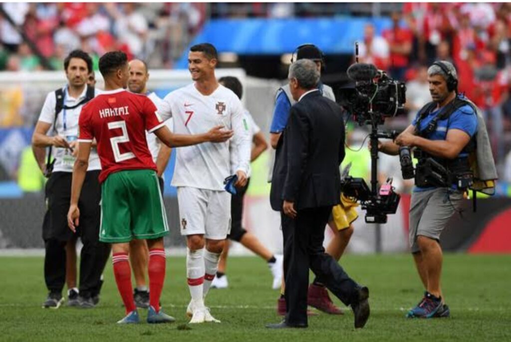 ورصدت الكاميرات مدافعا المنتخب المغربي وهم يواسيان كريستيانو بعد خروجه حزينا من المباراة بسبب هزيمة البرتغال .