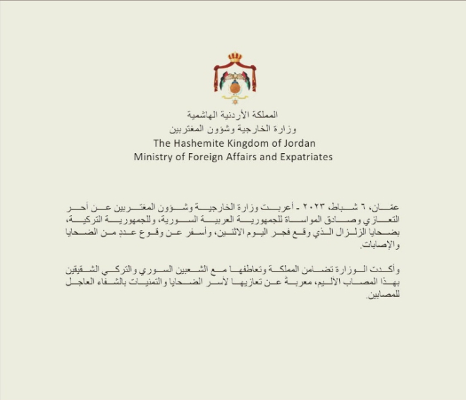 وقد أعلنت وزارة الخارجية، تفعيل خلية أزمة في غرفة عمليات وزارة الخارجية، وخلية أزمة أخرى في سفارتي الأردن في أنقرة ودمشق للاطمئنان على الأردنيين، بعد الزلزال الذي ضرب تركيا، كما دعت الأردنيين للالتزام بتعليمات السلطات والتواصل من خلال الخطوط الساخنة في الوزارة.