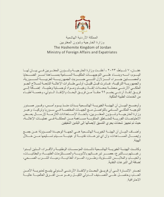 حيث انطلقت أولى طائرات الإغاثة التابعة لسلاح الجو الأردني محملة بمعدات إنقاذ وخيام ومواد لوجستية وطبية، وإرسال فريق إنقاذ أردني مكون من 99 منقذ من فريق الإنقاذ والبحث الدولي، بالإضافة إلى 5 أطباء من الخدمات لمساعدة المصابين من اثار الزلزال الواقع بجنوب تركيا وشمال غرب سوريا.