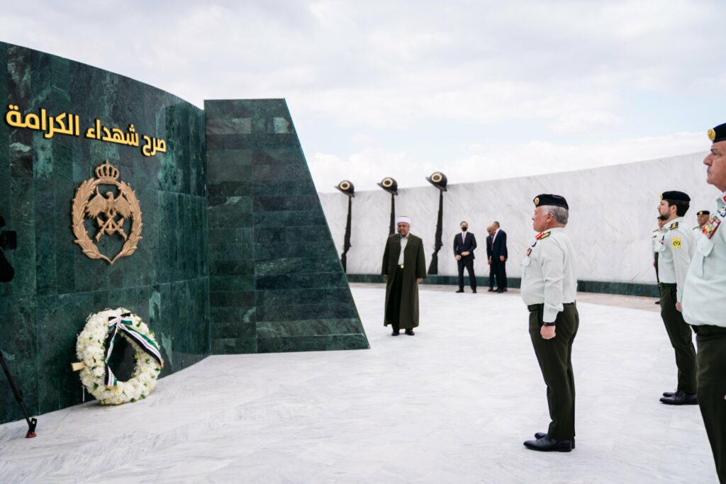 أطلقت المدفعية 21طلقة فور وصول جلالة الملك تحية له، وكان رئيس هيئة الأركان المشتركة اللواء الركن يوسف أحمد الحنيطي في استقبال جلالته، وحضر الحفل عدد من كبار المسؤولين المدنيين والعسكريين، وقام جلالته بوضع إكليلا من الزهور على الصرح التذكاري لشهداء المعركة، ودعا مفتي لشهداء الجيش العربي بالمغفرة والرحمة، وأن يحل عليهم الله الرضا وعظيم الأجر والإحسان مع النبيين والصديقين والصالحين.